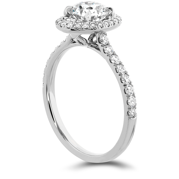 Our version of a fancy shaped diamond, this ring features our round brilliant diamond nestled in an oval-shaped halo with a diamond band. Accent diamonds in a tight pave setting are so precisely placed and undeniably brilliant that the result is the illusion of one large, oval-shaped center diamond.