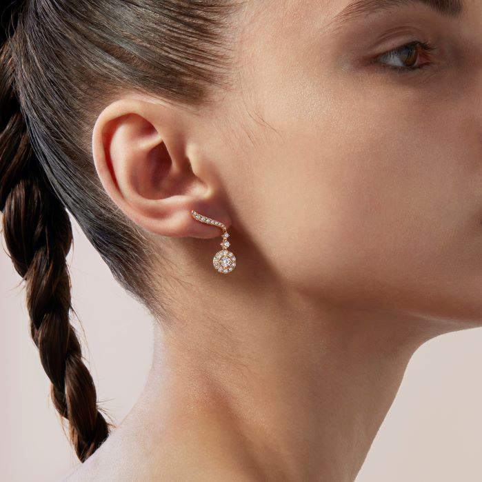 The most flattering silhouette, our Vela Drop Earrings climb the ear in one graceful motion. They are finished with a delicately dangling diamond.