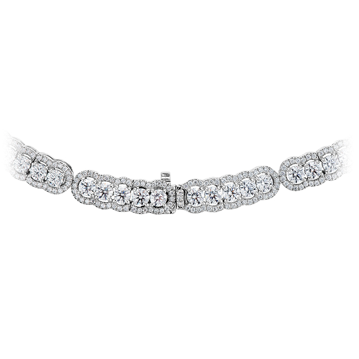 Exquisitely feminine, this line necklace features diamonds surrounded by intricate diamond halos, giving the design the look of woven diamond embroidery. The effect is a stand-out sparkle that absolutely cannot be missed.