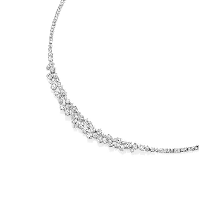 Brilliant diamonds cascade elegantly across the neck, shimmering with every movement and leaving a trail of radiant starlight in their wake.
