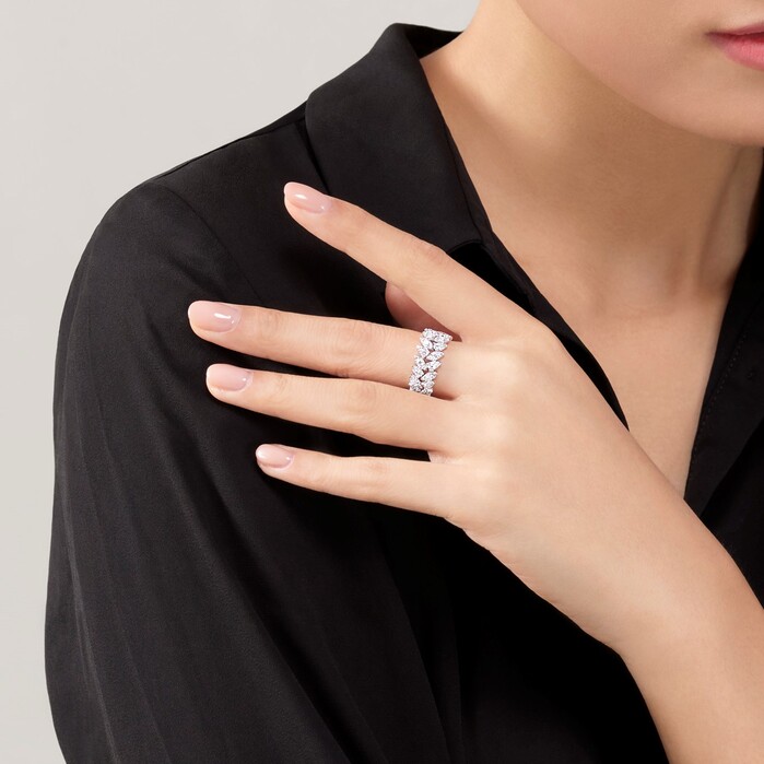 Double the diamonds, double the sparkle. The Aerial Double Dewdrop Ring dazzles with two rows of marquise and pear-shaped motifs encrusted in glittering diamonds. It's perfect for any occasion, day or night.