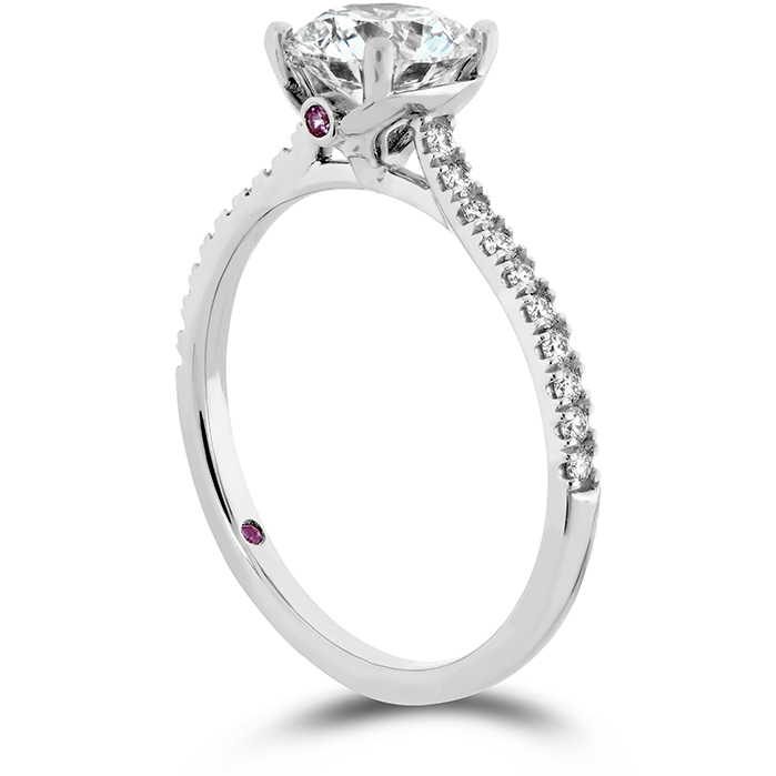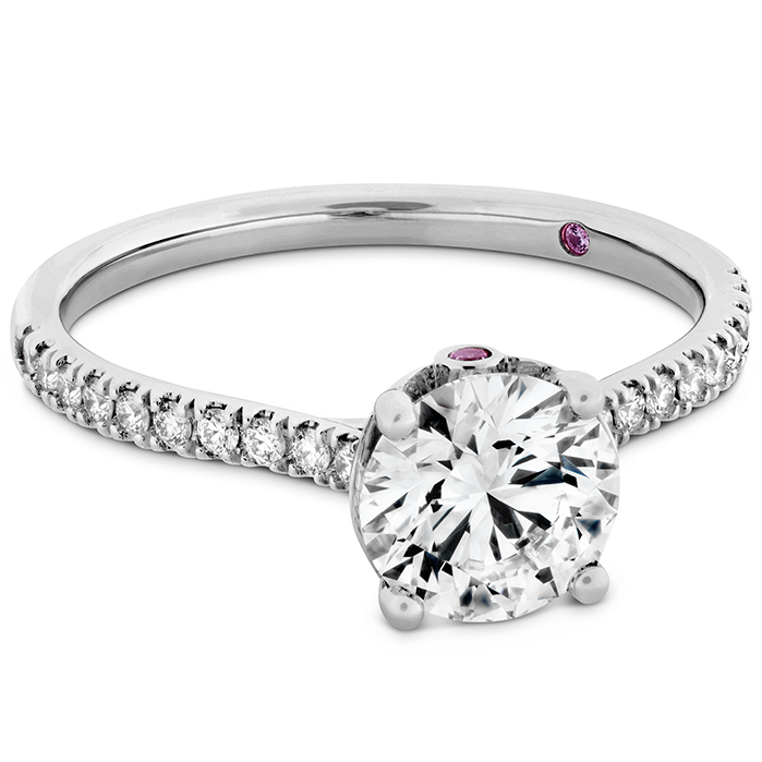 Equal parts minimalist and oh-so-romantic, this ring puts our perfectly cut diamond front and center on a diamond band. A pink sapphire sparkles underneath the gallery. This design features a sapphire on the inside of the band—an extra dash of sparkle just for you. As they were chosen by hand, these sapphires may vary slightly in shade from ring to ring.Equal parts minimalist and oh-so-romantic, this ring puts our perfectly cut diamond front and center on a diamond band, and was inspired by Hayley’s Sloane gown. A pink sapphire sparkles underneath the gallery. Each Hayley Paige for Hearts On Fire design features a sapphire in Hayley’s favorite shade of pink on the inside of the band—an extra dash of sparkle just for you. As they were chosen by hand, these sapphires may vary slightly in shade from ring to ring.