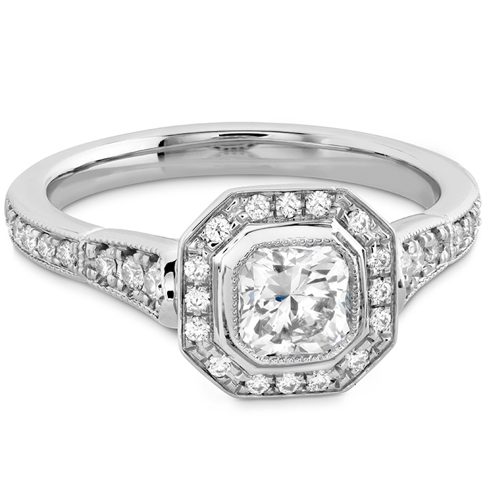 Old world style meets new world sparkle in this Art Deco-inspired design. A bezel-set center square-cut Dream diamond is surrounded by a halo of smaller diamonds and geometric detailing, making this architectural engagement ring a true standout.