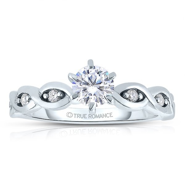 An elegant design this diamond engagement ring showcases a diamond on an infinity style band. This style accommodates various center stone sizes & shapes. Available in Platinum as well as 18K and 14K White Yellow or Rose Gold. Priced as shown 0.11cts 14K White Gold
