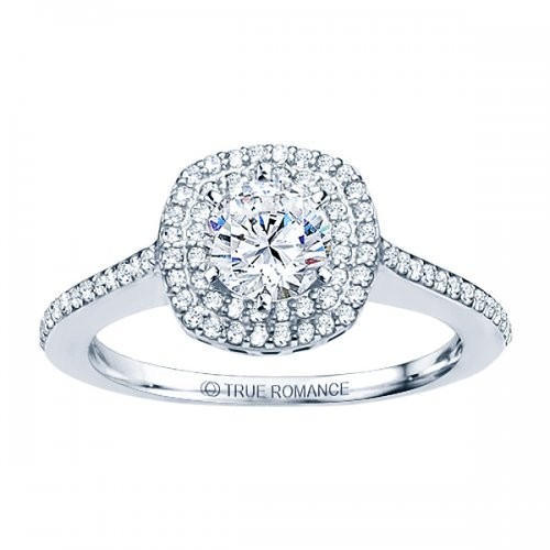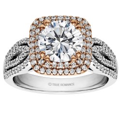 An elegant design this diamond engagement ring showcases a prong-set diamond double halo that crowns the round center stone. This style accommodates various center stone sizes & shapes. Available in Platinum as well as 18K and 14K White Yellow or Rose Gold. Priced as shown .54cts 14K White Gold