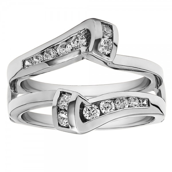 A beautiful design this diamond ring guard will showcase your solitaire in a channel set diamonds. This style accommodates most classic solitaire diamond rings. Available in Platinum as well as 18K and 14K White Yellow or Rose Gold.